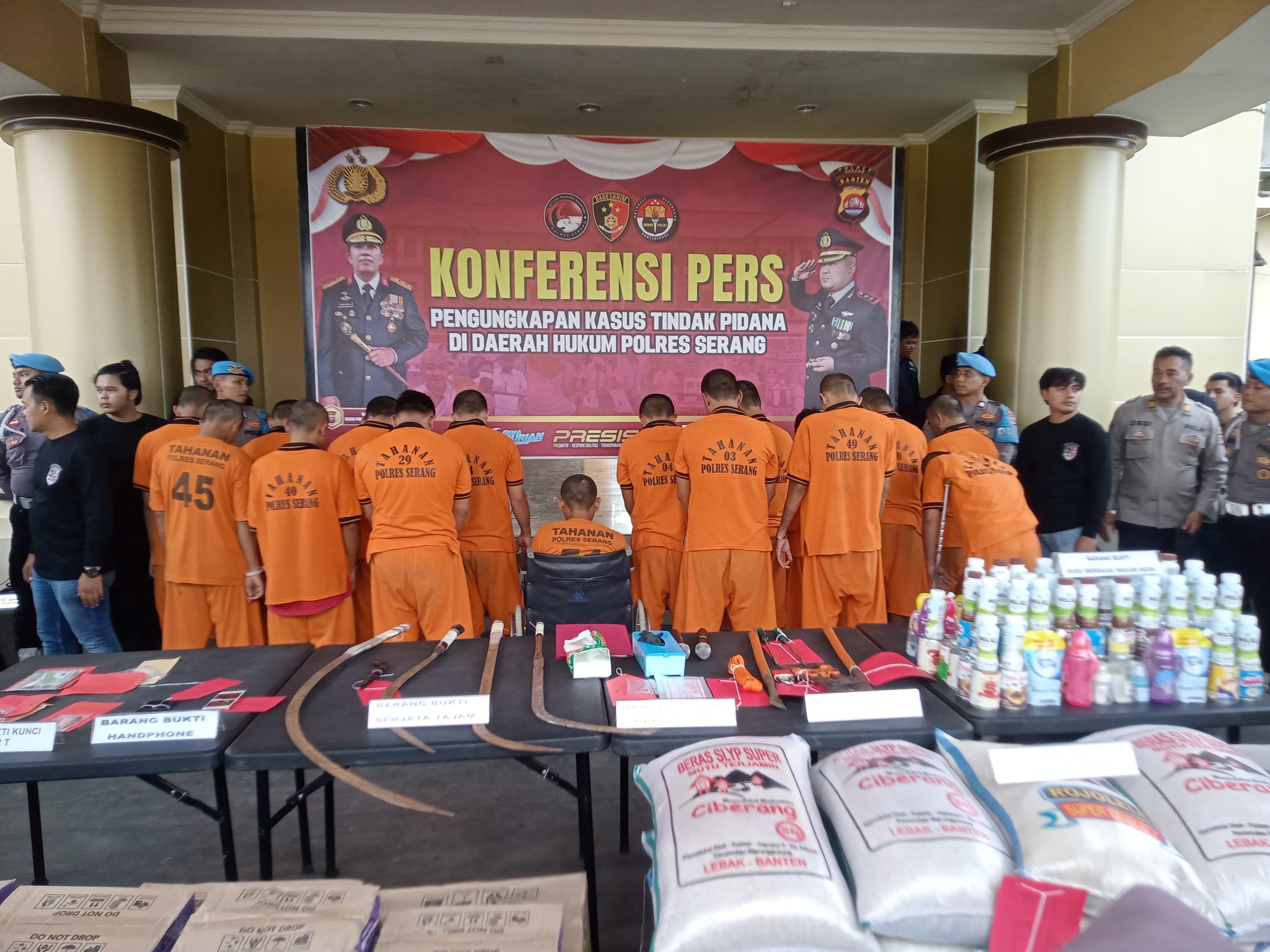 “Dari 16 pelaku yang ditangkap 7 diantaranya terpaksa dilakukan tindakan tegas karena membahayakan petugas, 3 diantaranya merupakan spesialis pembobol toko kelontongan dan kios beras yang beroperasi di Provinsi Banten,” terang Kapolres didampingi Wakapolres Kompol Ali Rahman CP Kasatreskim AKP Andi Kurniady ES dan Kasihumas AKP Dedi Jumhaedi.