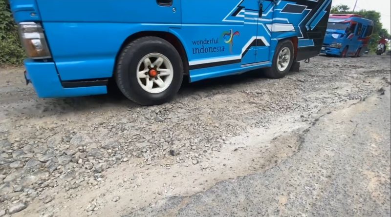 Ruas jalan tersebut mengalami kerusakan parah dengan banyak lubang besar di berbagai titik, sehingga dapat membahayakan bagi pengendara yang melintas.