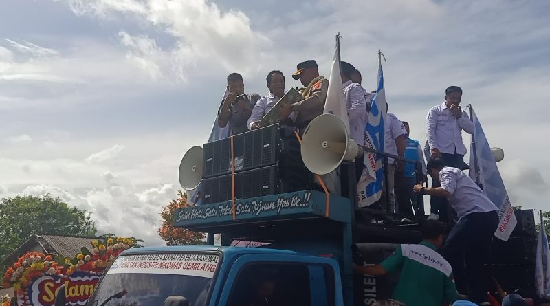 Ribuan warga dari berbagai elemen masyarakat memadati lapangan, mulai dari buruh, tokoh agama, organisasi masyarakat (ormas), lembaga swadaya masyarakat (LSM), komunitas ojek online, kelompok tani, hingga emak-emak lengkap dengan atribut.